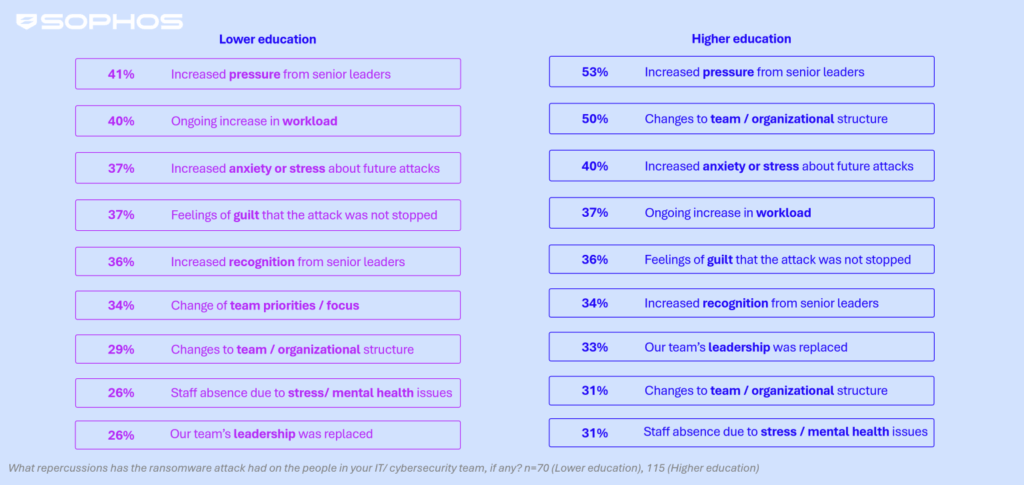 The survey makes clear that having data encrypted in a ransomware attack has significant repercussions for IT/cybersecurity teams in the education sector, with increased pressure from senior leaders cited as the most common consequence by both lower and higher education providers.