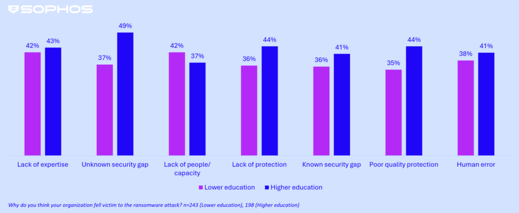 Organizational factors also varied. Nearly half (49%) of higher education providers identified unknown security gaps as the most common root cause. In lower education, the most frequently cited issues were a lack of expertise and limited capacity to respond to incidents (42% each). Overall, the results suggest higher education faces greater technology challenges, while lower education providers struggle more with staff-related pressures.