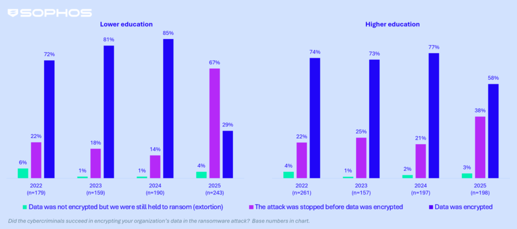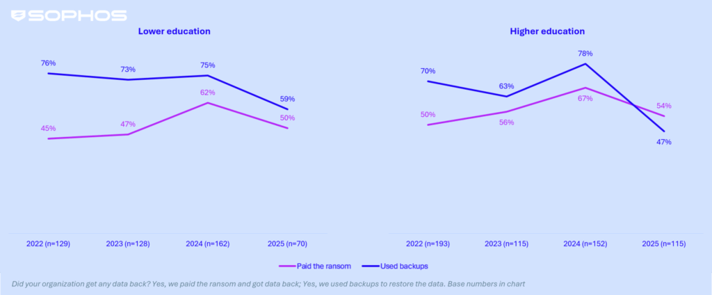 The use of backups to restore data among education providers has dropped to its lowest point in four years. Among those that had data encrypted, only 59% of lower education institutions and 47% of higher education providers restored data using backups (down from 75% and 78%, respectively). This decline highlights ongoing challenges with maintaining consistent and reliable backup practices across the sector. The rate of education providers paying the ransom to get data back showed a similar trend suggesting a greater reliance on multiple/alternative recovery methods.